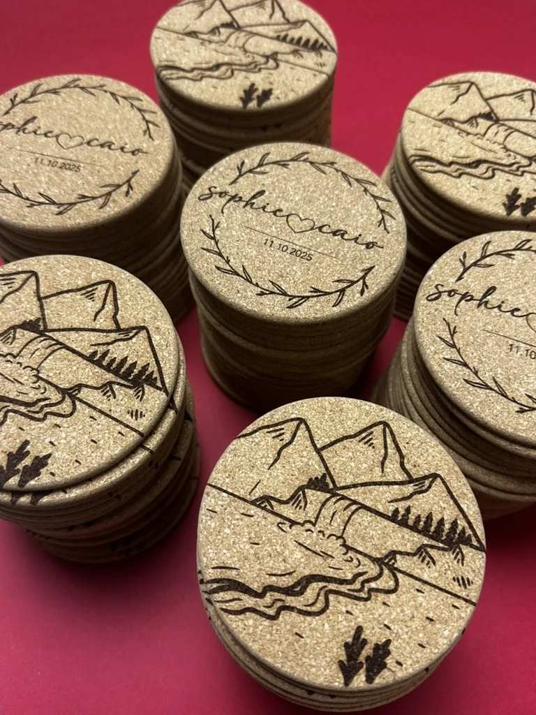 Coasters are out of cork and have fixed size of 9cm diameter. Both sides can be engraved. Pricing is per item and does not include shipping (varies on the quantity, from 2.89€ to 7.01€ in France, from 7.15€ to 18€ international)